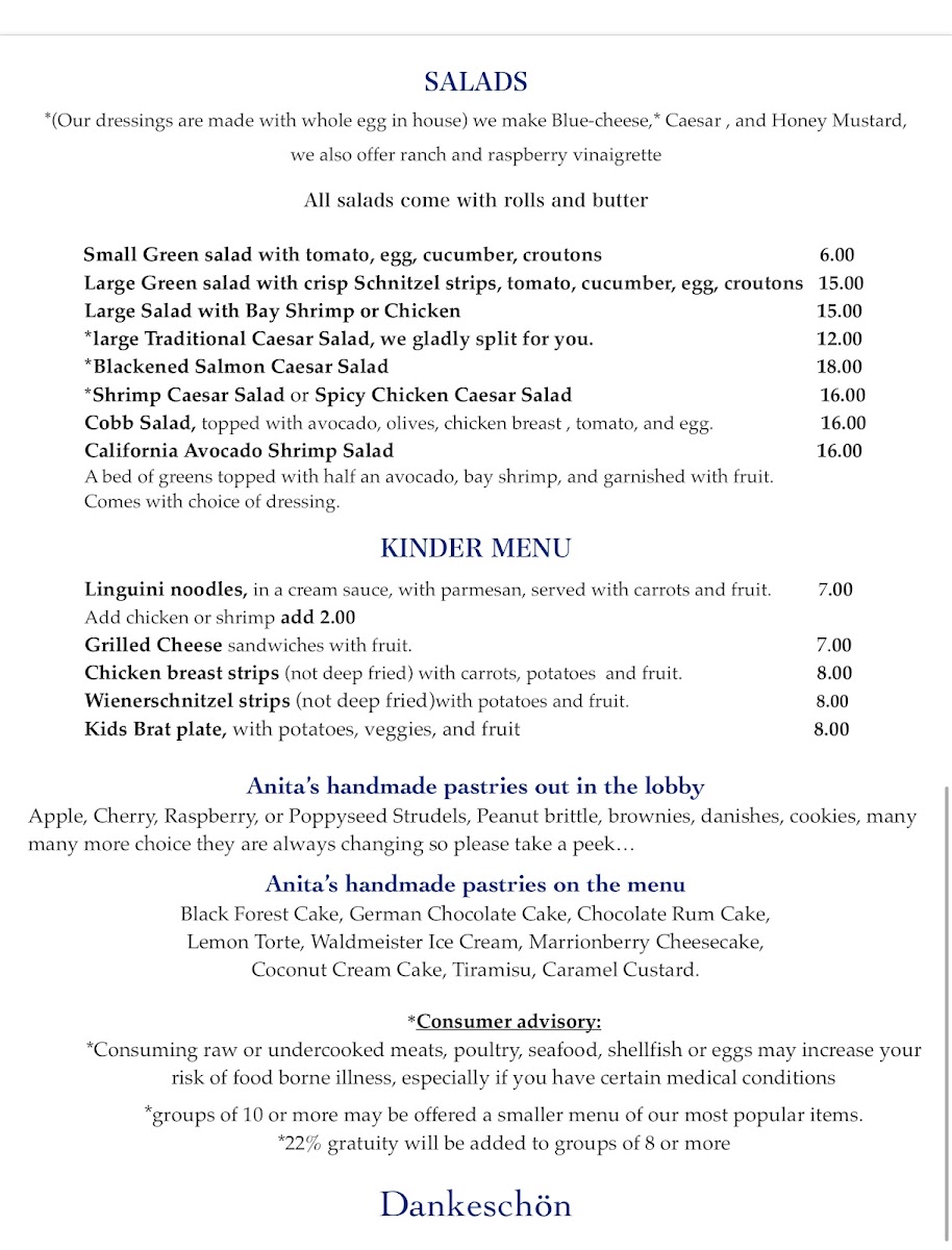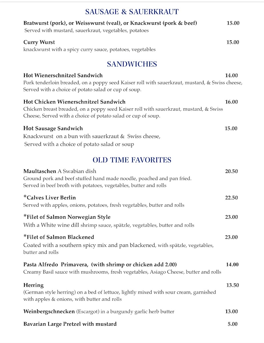 Expect to find a variety of schnitzel preparations, such as the crisp Wienerschnitzel and the savory Jagerschnitzel topped with wild mushroom sauce, typically served alongside spatzle, vegetables, and perfectly cooked potatoes. Light starters like dill pickle soup and a selection of fresh pastries set the tone early, while staple offerings like bratwurst with sauerkraut echo the restaurant’s Bavarian roots. For those seeking something a bit different, options like the schnitzel sandwich or Currywurst provide a casual bite fitting the comfortable, old-world atmosphere.